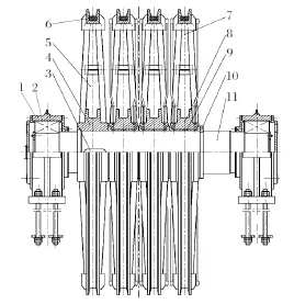大部分天輪裝置為普通天輪結(jié)構(gòu),主要由軸承座、兩端軸承、天輪軸、游動(dòng)輪、固定輪、軸瓦、襯墊和卡箍等組成,如圖1所示。其中,左端輪子為固定輪,與天輪軸靠平鍵聯(lián)接;右側(cè) 3 個(gè)輪子為游動(dòng)輪,游動(dòng)輪與天輪軸之間有軸瓦,軸瓦與游動(dòng)輪轂之間靠高強(qiáng)度螺栓聯(lián)接;軸瓦內(nèi)部有儲(chǔ)油槽,通過潤滑油脂來實(shí)現(xiàn)游動(dòng)輪與天輪軸靈活轉(zhuǎn)動(dòng)。當(dāng)每根鋼繩的線速度不完全相同時(shí),游動(dòng)輪與天輪軸之間可自由地相對(duì)轉(zhuǎn)動(dòng),防止鋼絲繩與襯墊之間產(chǎn)生滑動(dòng)摩擦,避免襯墊過度磨損,起到保護(hù)鋼絲繩的作用。zui 右側(cè)游動(dòng)輪的軸向定位通過安裝在天輪軸環(huán)形槽內(nèi)的兩半卡箍實(shí)現(xiàn),為了保證各游動(dòng)輪之間的間隙合適 (一般為0.2~0.5 mm),卡箍的厚度根據(jù)安裝實(shí)際情況進(jìn)行單配。該結(jié)構(gòu)的天輪裝置應(yīng)用較為廣泛,技術(shù)成熟。