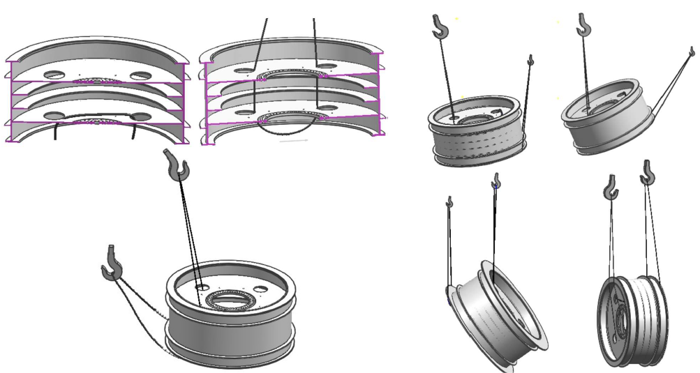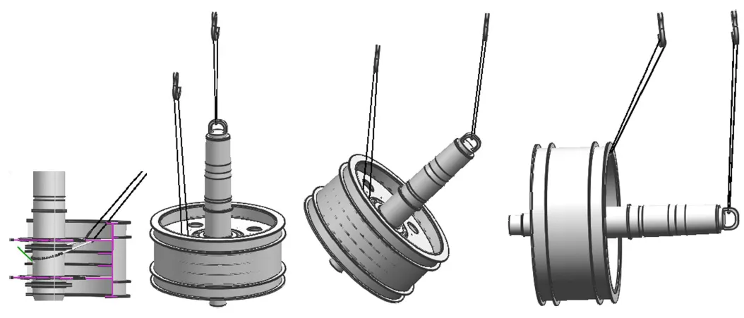 吊點附近的輪子輪緣之間,需用螺紋千斤頂輔助支撐,以防止在起吊中變形;起吊翻轉過程中人員與工件要保持足夠的安全距離,避免千斤頂墜落傷人。