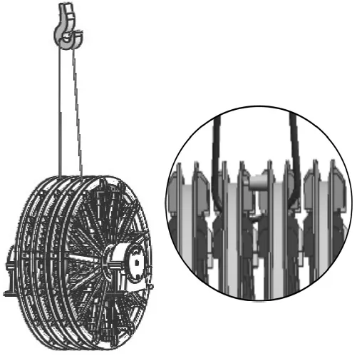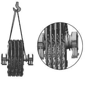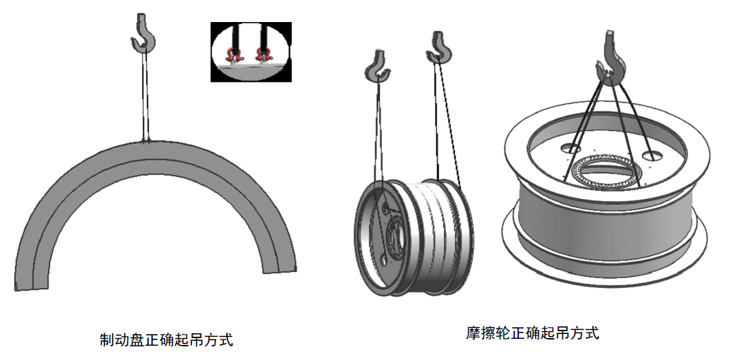 采用兩根等長鋼絲繩,左、右側各掛一根鋼絲繩,吊點在由上到下第三個輪子的上、下槽鋼中間空隙處,不準許直接兜吊下側槽鋼。此種起吊方式嚴禁帶軸承座及端蓋。