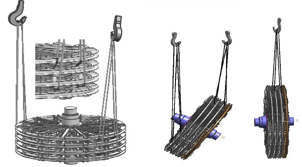 采用四根等長鋼絲繩,主鉤掛兩根,副鉤掛兩根;鋼絲繩兜在第 二個和第三個輪子的輪緣內側。主、副鉤配合進行翻轉。