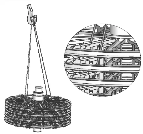 采用兩根鋼絲繩,主鉤鋼絲繩從上方腹板中一人孔穿入,繞過主軸,從同一人孔穿出。副鉤鋼絲繩通過工裝吊盤,吊在主軸上方,起輔助調平作用。主軸兩端的螺釘孔僅用于把吊具,不能直接把吊環(huán)螺釘起吊。