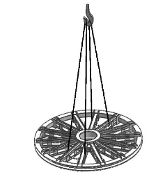 4m以下規(guī)格天輪裝置:采用兩根等長鋼絲繩。鋼繩兜吊中間兩個輪子的輪緣,兩根鋼絲繩分別掛在同一處槽鋼的左、右兩側。為防止輪子變形,兩吊掛輪子之間需用千斤頂支墊。