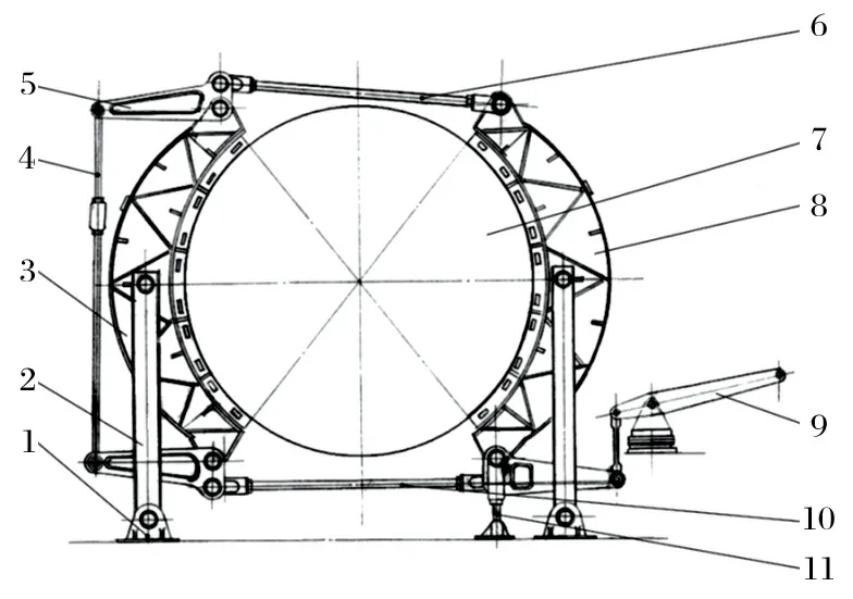(6)方案簡單 對于滾筒直徑大于4 m 的舊式提升機,推 薦采用氣壓-重錘平移式制動器。該改造方案不僅保留了滾筒制動輪構(gòu)件、基礎(chǔ)、前后制動梁,還保留了三角杠桿和頂部拉桿,方案更為簡單。以 HKMZ 型提升機為例,改造前后分別如圖4、5 所示。對比兩圖可知,改造量更少,因而成本更低,且造型美觀,達到了預(yù)期的效果。