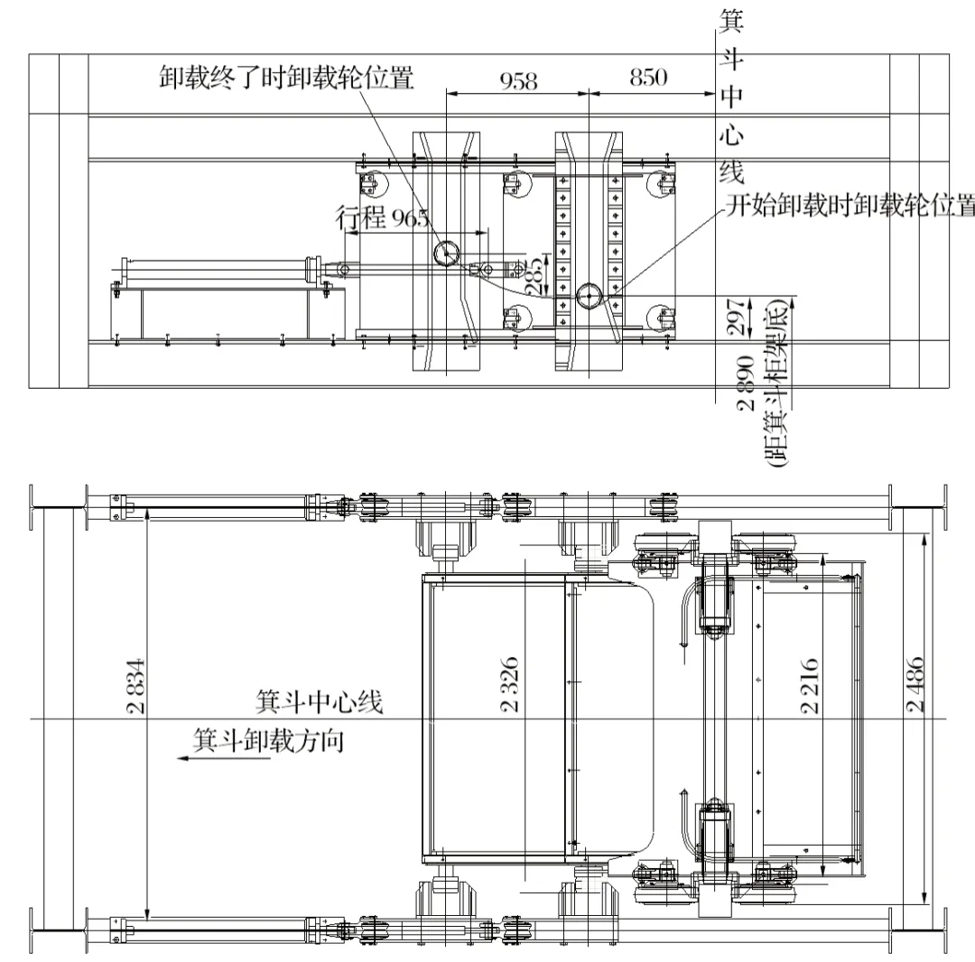 (2)這種2個(gè)卸礦點(diǎn)應(yīng)用在同一箕斗的卸礦方式在我國(guó)尚屬shou 次,會(huì)澤礦3號(hào)豎井是目前wei 一在用的雙卸載點(diǎn)礦井。一般的礦井一個(gè)井筒采用一個(gè)卸礦點(diǎn),多個(gè)水平的多點(diǎn)卸礦一般要打多個(gè)井筒。為了多點(diǎn)卸礦功能的順利實(shí)現(xiàn),移動(dòng)直軌到位精度偏差不能超過(guò)±5 mm,并且應(yīng)滿足鋼絲繩正常的彈性變形伸縮量的卸載要求。多點(diǎn)卸礦為礦山開采節(jié)約了大量成本,移動(dòng)直軌卸載裝置如圖2所示。