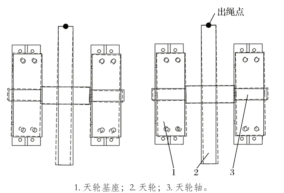 2.2 天輪移位 確定好旋轉基準點后,以此點為圓心調整 1 號天輪基座,1 號天輪基座沿出繩點順時針水平旋轉一定角度,使天輪入繩點對準滾筒中 心布置,使得天輪鋼絲繩的內外偏角基本相等;2 號天輪基座逆時針旋轉一定角度,對準其所對應的滾筒的中 心位置,全部轉到指 定位置后,對基座進行固定,如圖 3 所示。