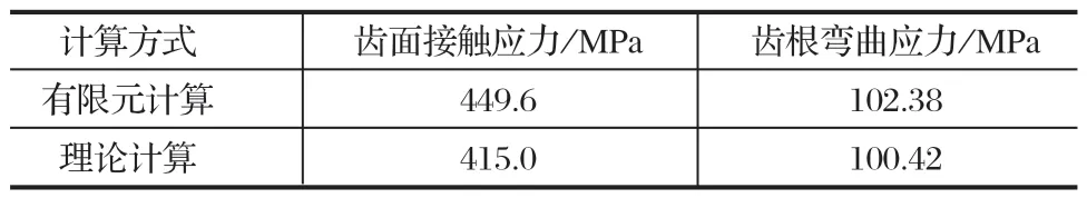 由圖6、7可知,齒面zui大接觸應力出現在齒面分度圓附近,為449.6M Pa;zui大彎曲應力出現在接觸齒面對側齒根,為102.38MPa。仿真結果與理論計算結果對比如表3所列,可見有限元模型計算結果與理論計算結果相一致,接觸應力的誤差為8.3%,彎曲應力的誤差為1.9%,選取材料的安全系數為2,則計算結果均低于材料許用應力792M Pa,說明該模型精度可靠,齒輪滿足靜強度計算需求。