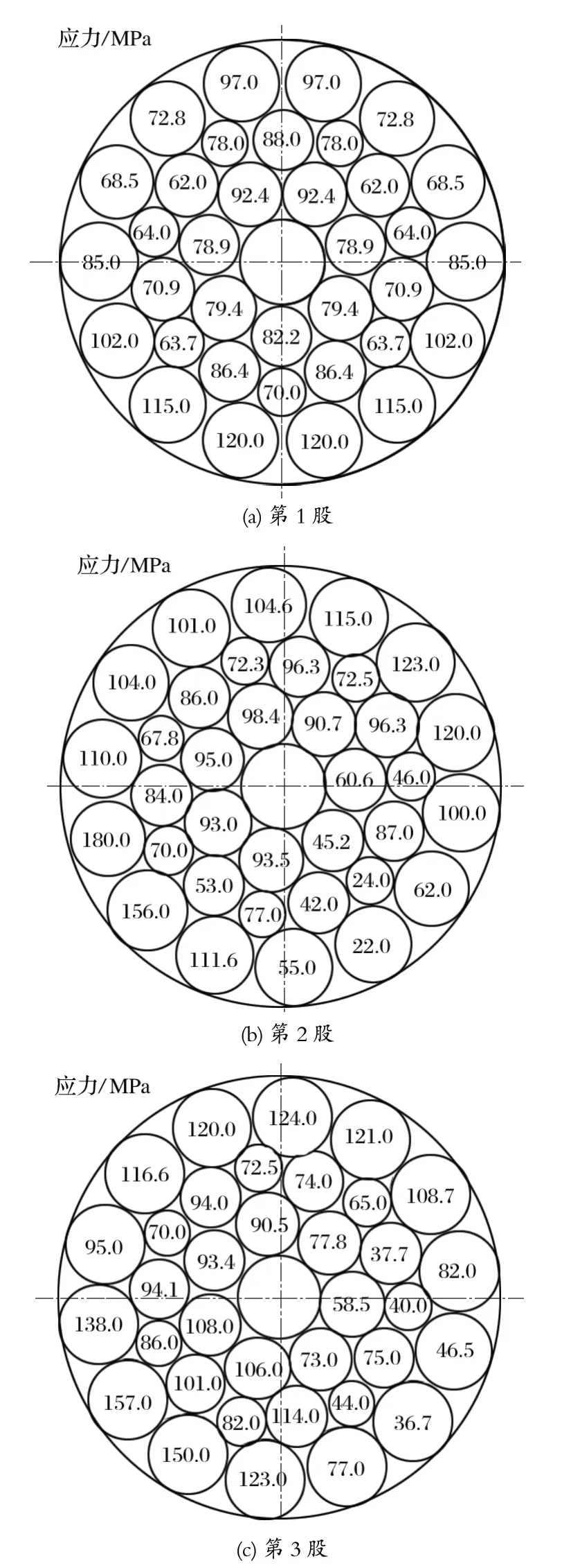 由圖4 可知,鋼絲繩第 1 至第 4 股內第 1 層至第3 層鋼絲的總體應力為 94.08、90.08、71.20 和 117.80 MPa。從圖中可以看出,鋼絲繩芯中 心軸的對稱軸位置處,第 1 股和第 4 股的鋼絲繩應力是沿著左右方向對稱分布的;右同向捻和右交互捻鋼絲繩靠近繩芯的位置彎曲應力較大。為了研究提升鋼絲繩的應力分布及分布規律,采用有限元分析法建立鋼絲繩物理模型并進行數值模擬,可以直觀得到鋼絲繩內部以及繩股之間的應力分布。