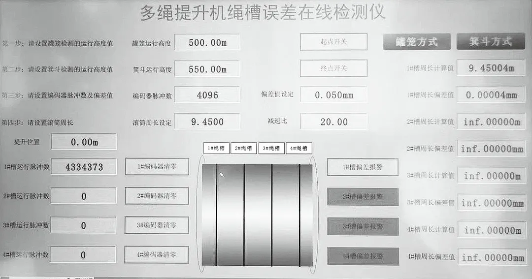 繩槽誤差在線檢測(cè)報(bào)警裝置的功能:①旋轉(zhuǎn)編碼器測(cè)量卷筒的周長(zhǎng),將繩槽直徑放大 3.14 倍,如果運(yùn)行 50 圈,相當(dāng)于放大了 157 倍,準(zhǔn)確性高,存儲(chǔ)系統(tǒng)對(duì)測(cè)距數(shù)值進(jìn)行存儲(chǔ);②PLC 記數(shù)運(yùn)算裝置具有比較功能,繩槽誤差超過要求時(shí),顯示器上會(huì)出現(xiàn)報(bào)警畫面,及時(shí)提醒提升機(jī)管理員進(jìn)行調(diào)繩,避免出現(xiàn)提升事故;③其余數(shù)據(jù)信息通過顯示器進(jìn)行動(dòng)態(tài)顯示,可以直觀了解每根鋼絲繩的運(yùn)行速度,每個(gè)繩槽的直徑誤差,易于發(fā)現(xiàn)繩槽磨損規(guī)律,提高檢查及檢修的工作效率。繩槽誤差監(jiān)控應(yīng)用如圖1 所示,繩槽誤差監(jiān)控軟件報(bào)警界面如圖2 所示,提升機(jī)卷筒直徑計(jì)算界面如圖3 所示。